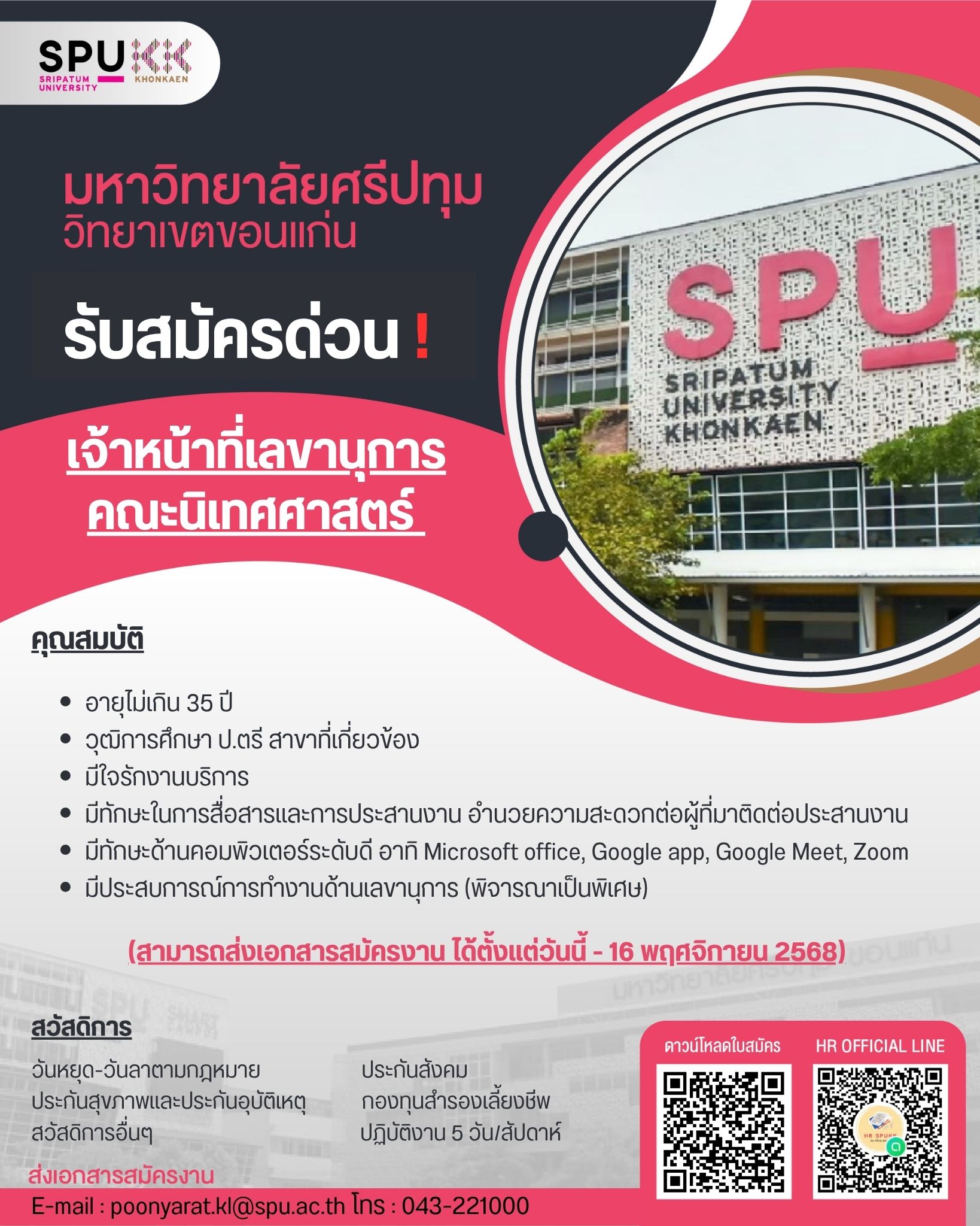 สามารถส่งใบสมัครออนไลน์ได้ที่ E-mail poonyarat.kl@spu.ac.th หรือกรอกใบสมัครได้ด้วยตนเองที่ห้องทรัพยากรบุคคล อาคาร 2 ชั้น 2 (ห้อง 1-202) มหาวิทยาลัยศรีปทุม วิทยาเขตขอนแก่น ที่อยู่ 182/12 หมู่ 4 ถ.ศรีจันทร์ ต.ในเมือง อ.เมือง จ. ขอนแก่น ในวันและเวลาราชการ
